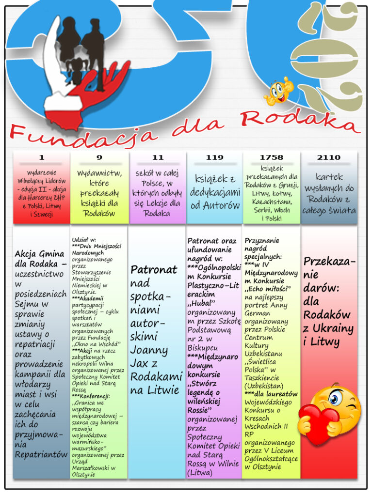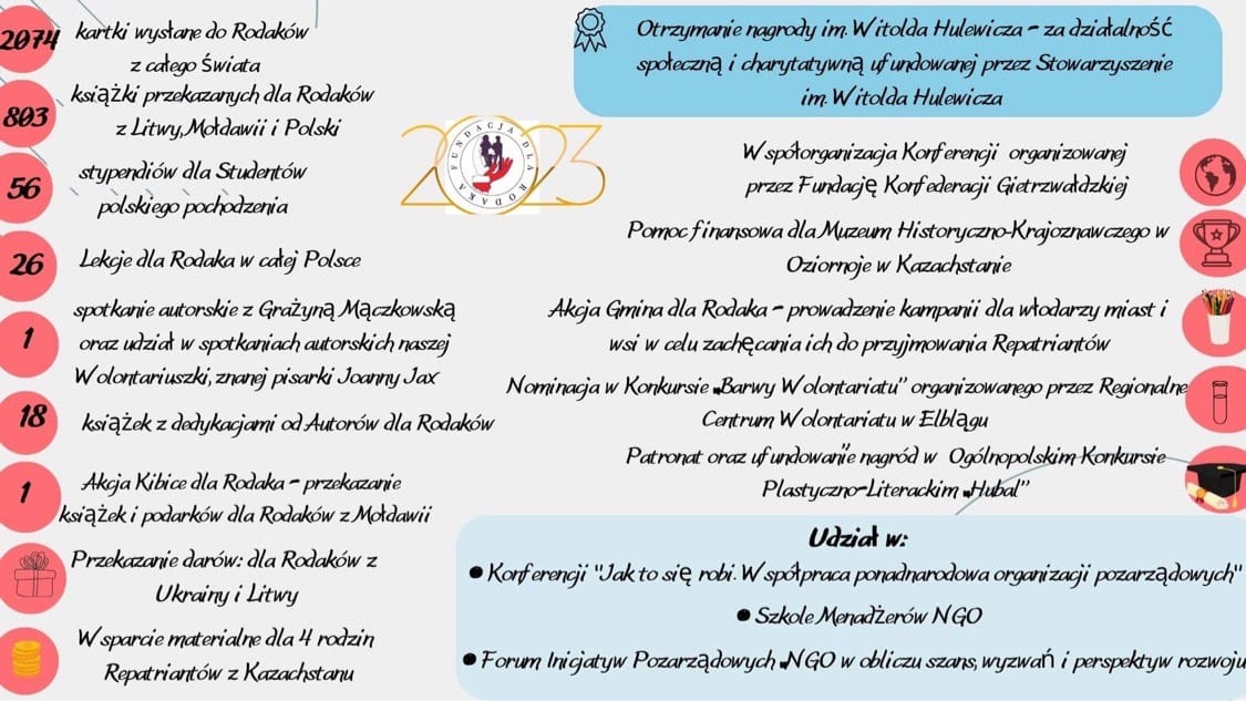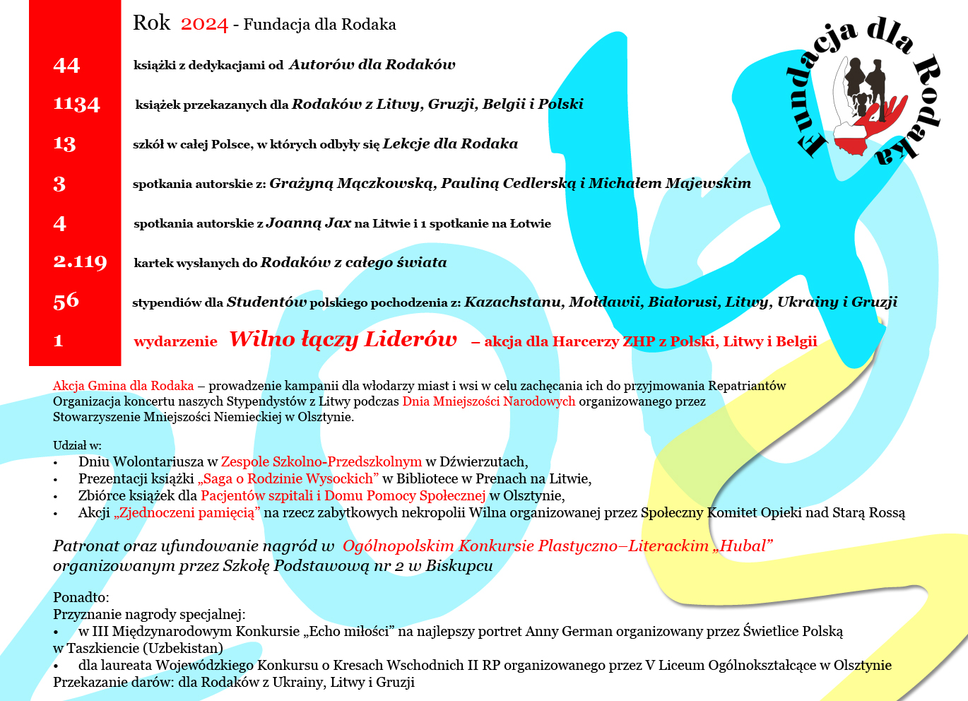 Ponadto planujemy powrócić do Akcji Wakacje dla Rodaka i zaprosić na letni wypoczynek dzieci polskiego pochodzenia z Kazachstanu oraz zorganizować spotkanie z Repatriantami i naszymi Stypendystami.